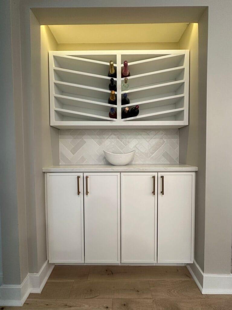 Our remodeling work included a new kitchen, updated bathroom, custom pantry, laundry room, and mudroom, as well as a custom wine rack and modern fireplace installation. Each space blends timeless design with everyday functionality.