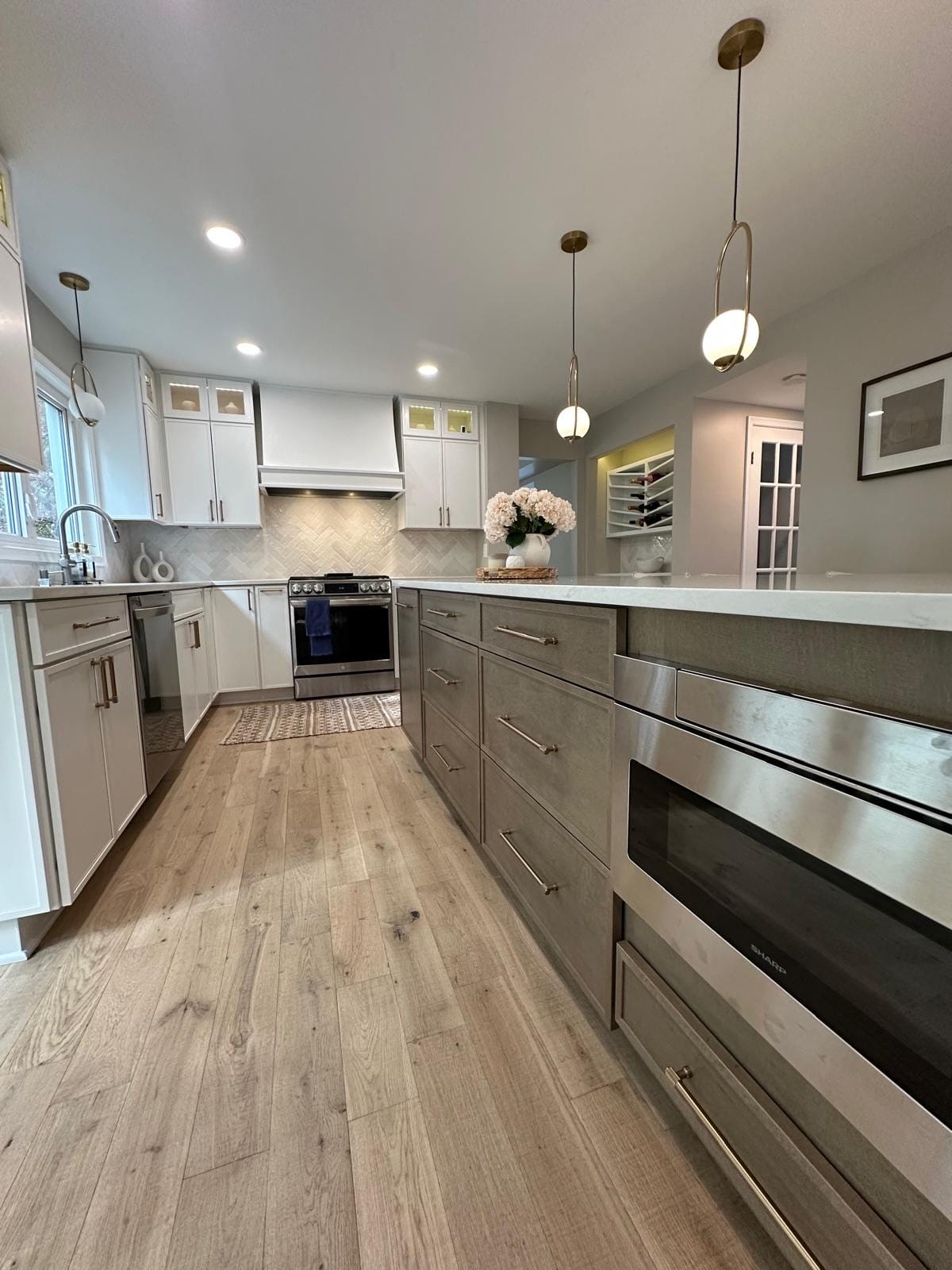Elegant brass pendant lighting adds modern sophistication, casting warm light over the workspace. The subtle herringbone backsplash introduces refined texture without overwhelming the clean aesthetic. Integrated appliances maintain the streamlined look while providing ample storage solutions that keep everything organized and within reach.
