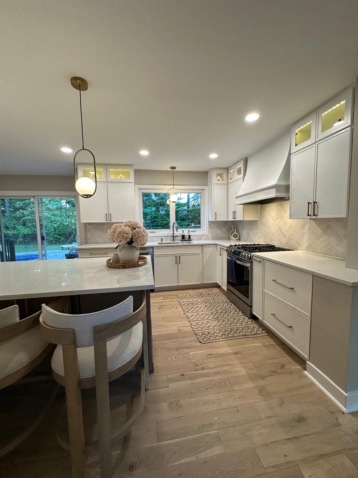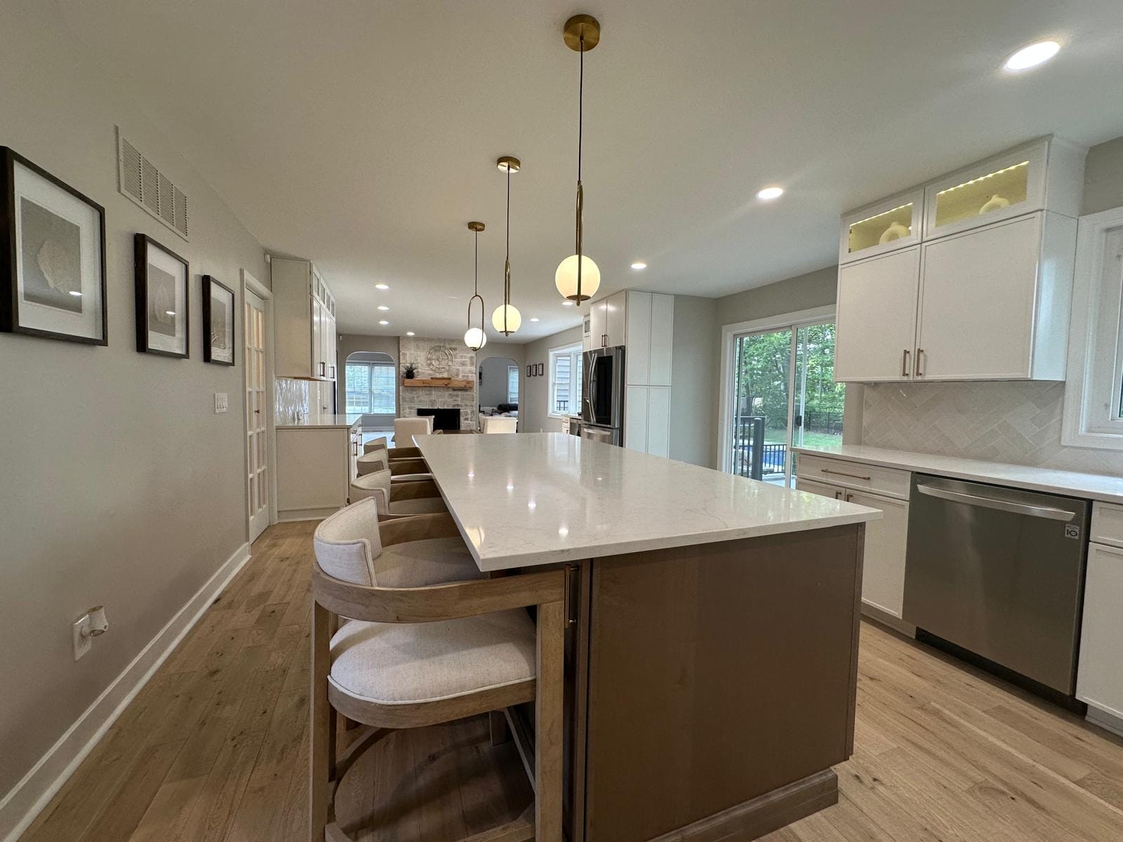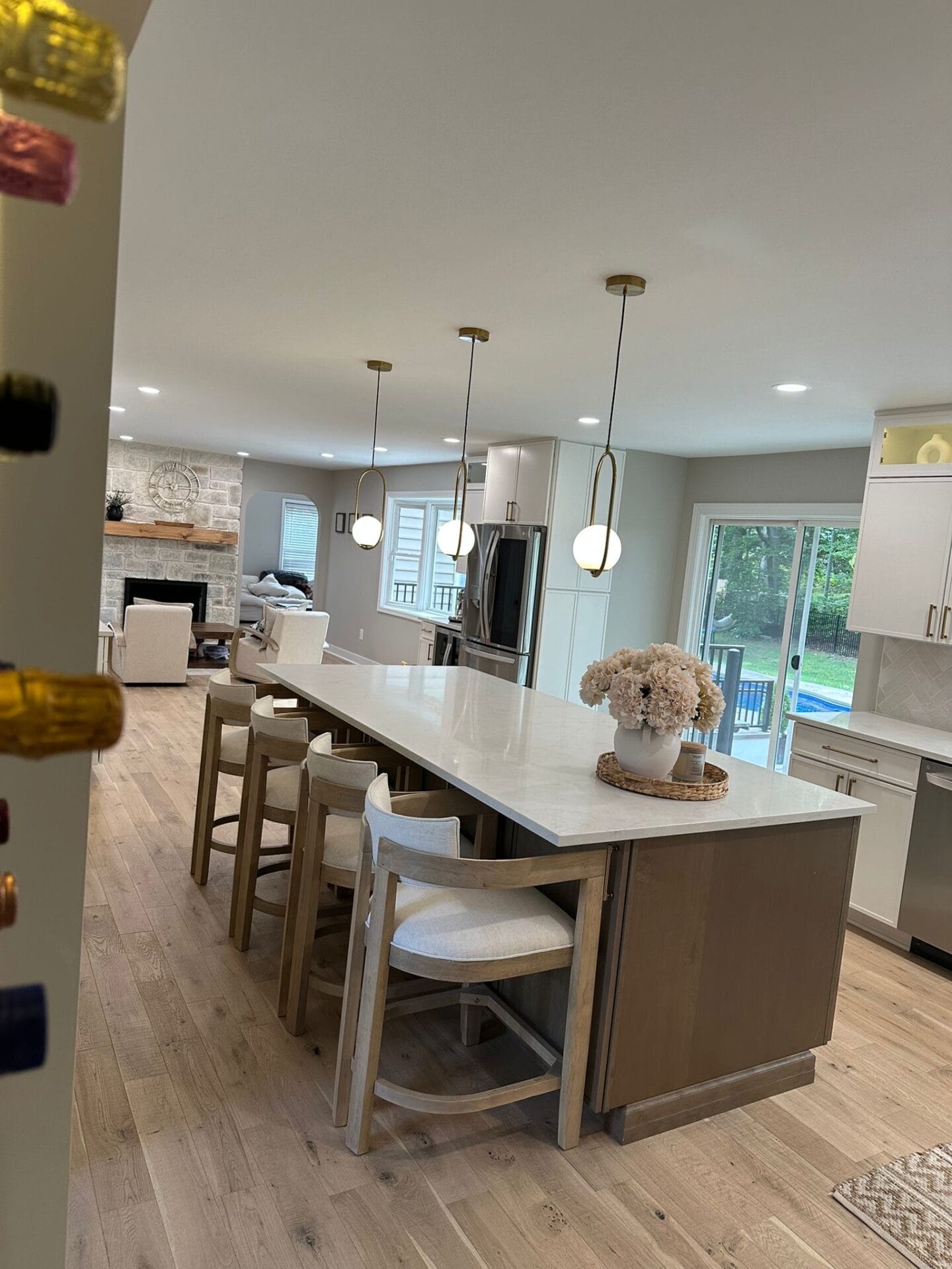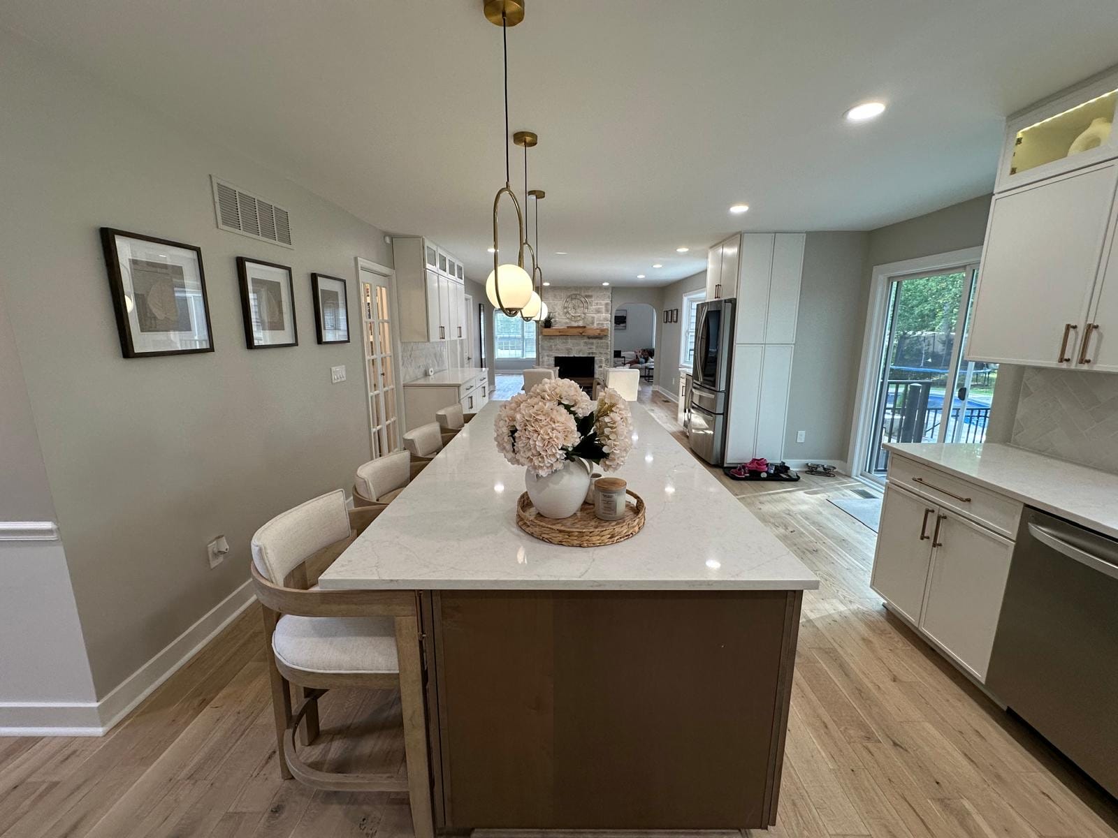 This stunning kitchen remodel serves as the heart of the Yardley home, featuring a generous island with comfortable seating that encourages gathering and conversation. The durable quartz countertops provide both beauty and practicality, while the sophisticated two-tone cabinetry combines warm wood finishes with crisp white elements.