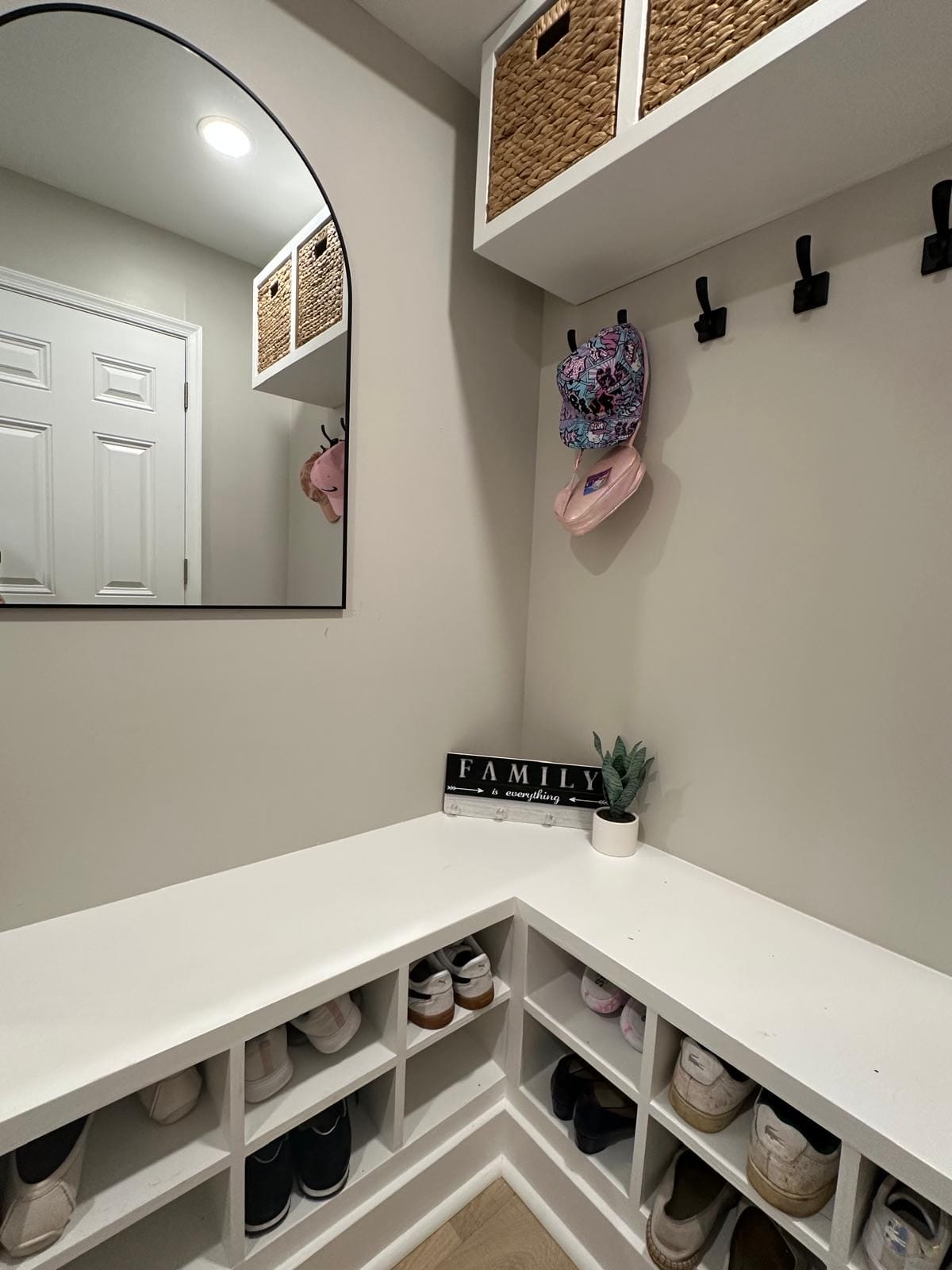 Personal storage cubbies for each family member ensure everyone has their own space for coats, shoes, and daily essentials.