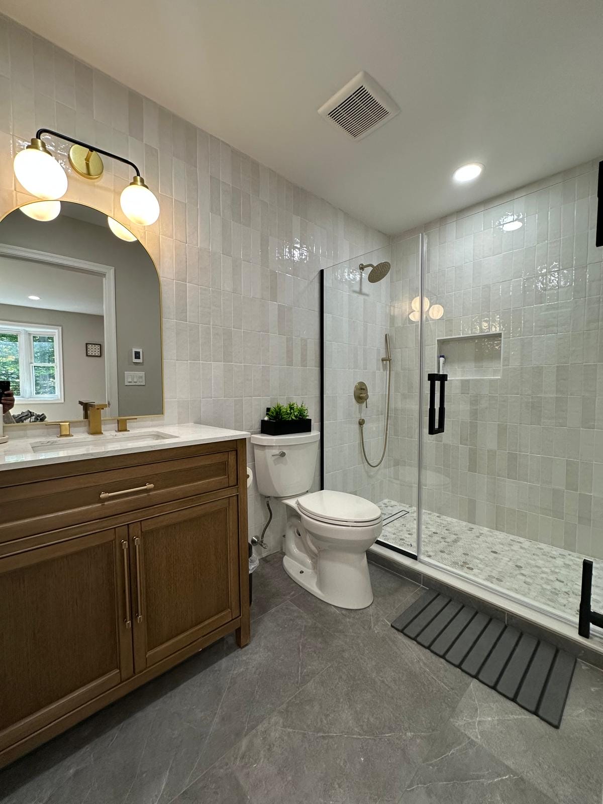 The optimized layout maximizes both space and functionality, ensuring every morning and evening routine feels effortless and indulgent. This bathroom remodel perfectly balances form and function in true organic modern style.